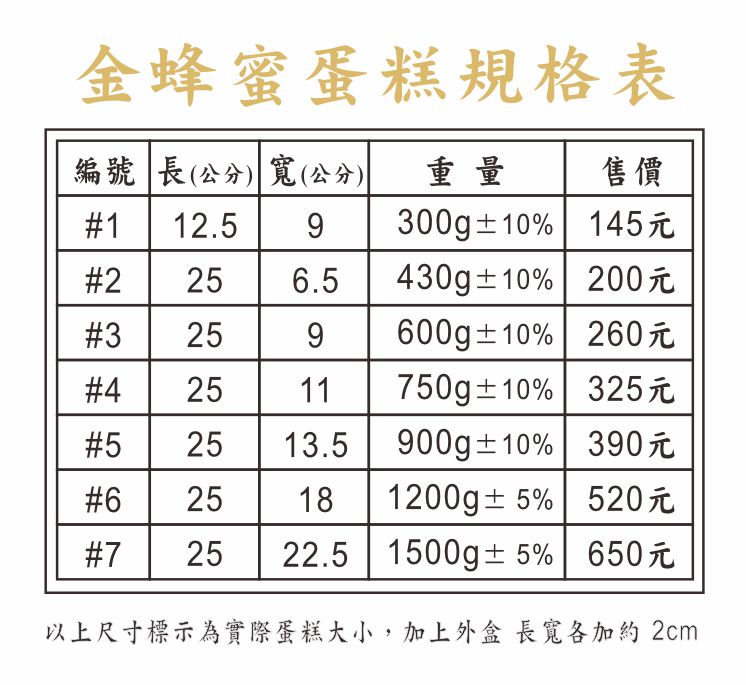 首頁 產品介紹 金蜂蜜蛋糕 金蜂蜜蛋糕 01 金蜂蜜蛋糕 獨特手工製作流程,三層木框烤焙,三次爐內攪拌,成就精典美味。金蜂蜜蛋糕(蜂蜜原味)是以純正龍眼蜜、精選原料及獨特手工的烘焙方法製作,製作嚴謹。完全不添加防腐劑、乳化劑、膨發劑,堅持給您天然烘焙的美味。是您彌月、週歲、交際、訂婚、生日送禮時的最佳選擇。賞味期限:常溫三天、冷藏七天 1198999